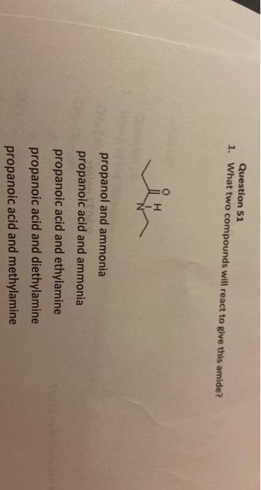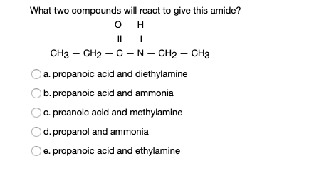 Solved What Two Compounds Will React To Give This Amide Mlpropanoic Acid And Methylamine Propanol And Ammonia Propanoic Acid And Diethylamine Propanoic Acid And Ethylamine Propanoic Acid And Ammonia